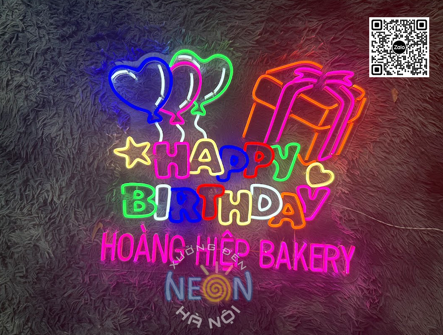 Mô tả: Chữ “Happy Birthday” với hình bong bóng neon, ánh sáng đa màu sôi động.
